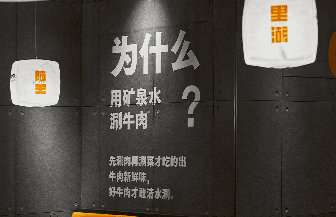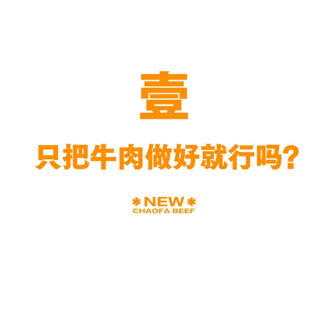 除了视觉外,我们还希望用风格强烈的文案来强化潮汕牛肉的新鲜。大面积素色清水混凝土墙面非常适合大字报体的文案展示,大字体的醒目度和简单直接的“新鲜牛肉”内容文案都是为了强化牛肉的鲜,突出产品。
