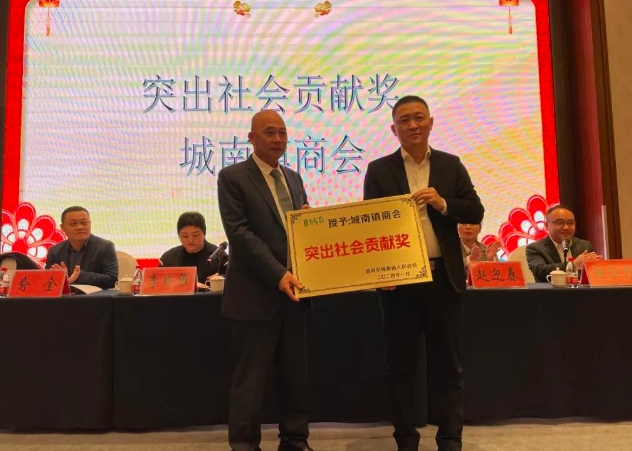 会上,郑君宏为城南镇商会颁发突出社会贡献奖郑君宏、林一科为荣获社会贡献奖的企业颁奖。