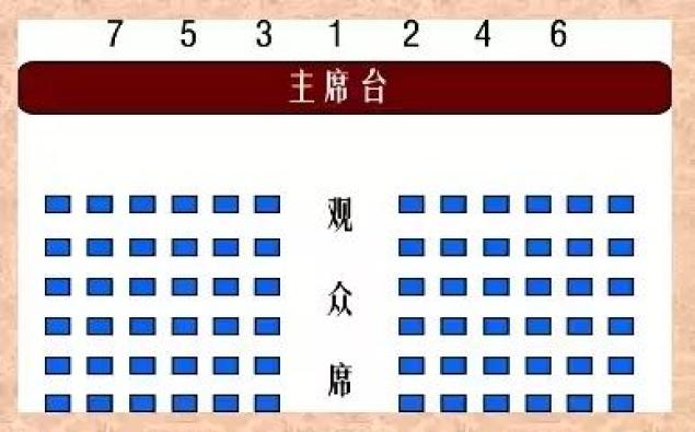 主席台座次排列,领导为单数时,主要领导居中,2号领导在1号领导左手位置,3号领导在1号领导右手位置;可参见下图的座次排列图: