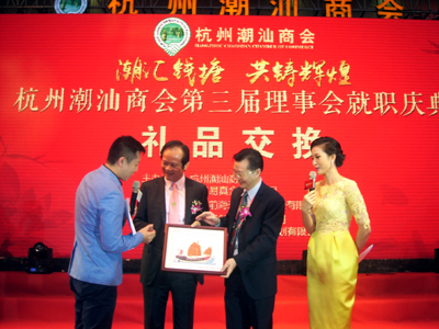 10月5日,杭州潮汕商会第三届理事会就职庆典在杭州太虚湖假日酒店举行,浙江省、杭州市及潮汕四市的领导,各地潮汕商会会长及海外嘉宾逾千人欢聚一堂,共同见证这一喜庆时刻。汕头市人大常委会常务副主任黄俊潮、市政协副主席谢铿和市工商联主席黄茂强、党组书记孔德镐、副主席郑晶等出席就职典礼。