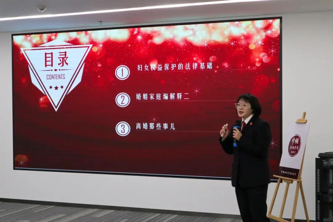 区法院新登人民法庭副庭长俞菲,就女性职场权益保护暨《守护“她”力量》为主题进行了分享。俞法官从平等就业权、人格权、同居关系析产纠纷等具体案例着手,重点为大家讲解了《妇女权益保障法》以及2月1日刚实施的《关于适用
