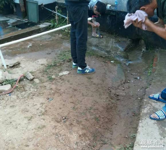 被扣押同胞在卢本巴希移民局里唯一的水龙头洗漱