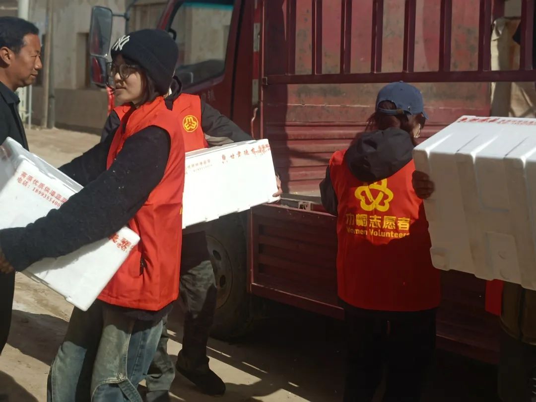 “这批桌凳正好解决我们露天用餐的难题!”来自杭州的大学生志愿者擦拭着额头的汗水,接过略显斑驳的课桌椅。在她身后,由市、县妇联以及女企业家商会妇联筹措的价值两万元物资正有序卸车:码放整齐的矿泉水在沙地上筑起“蓝色城墙”,筐筐新鲜蔬菜透着春意,成箱鸡蛋裹着防震泡沫,与折叠凳、旧桌椅共同构筑起沙漠里的温暖驿站。