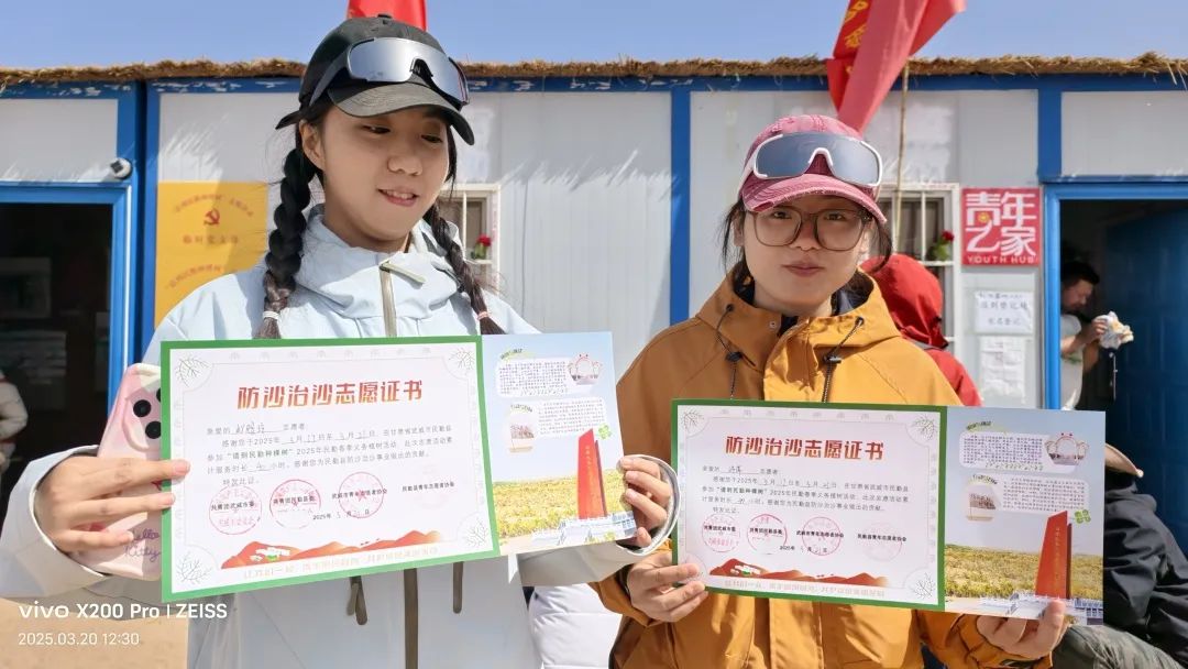 烈日当空,民勤县收成镇沙丘连绵处,数百名志愿者正挥锹培土,新栽的梭梭苗在春风中舒展嫩枝。不远处,两辆满载物资的货车驶入营地,鲜艳的“巾帼志愿者”红马甲在黄沙中格外醒目......