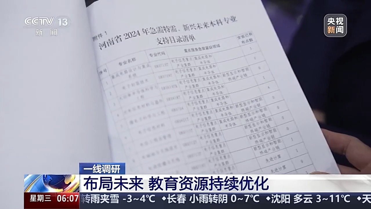 在河南省教育厅,记者看到了这份《河南省2024年急需特需、新兴未来本科专业支持目录清单》,表格里标注着急需紧缺领域和对口专业,电子信息、智能制造、先进装备、新材料等前沿领域成为“高频词”。