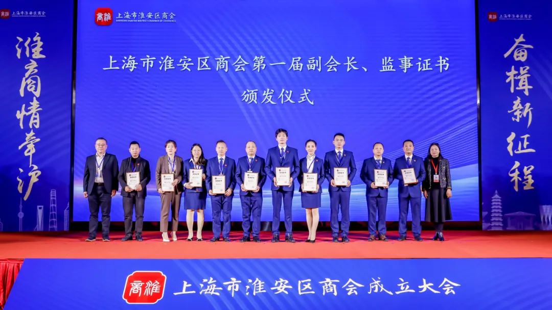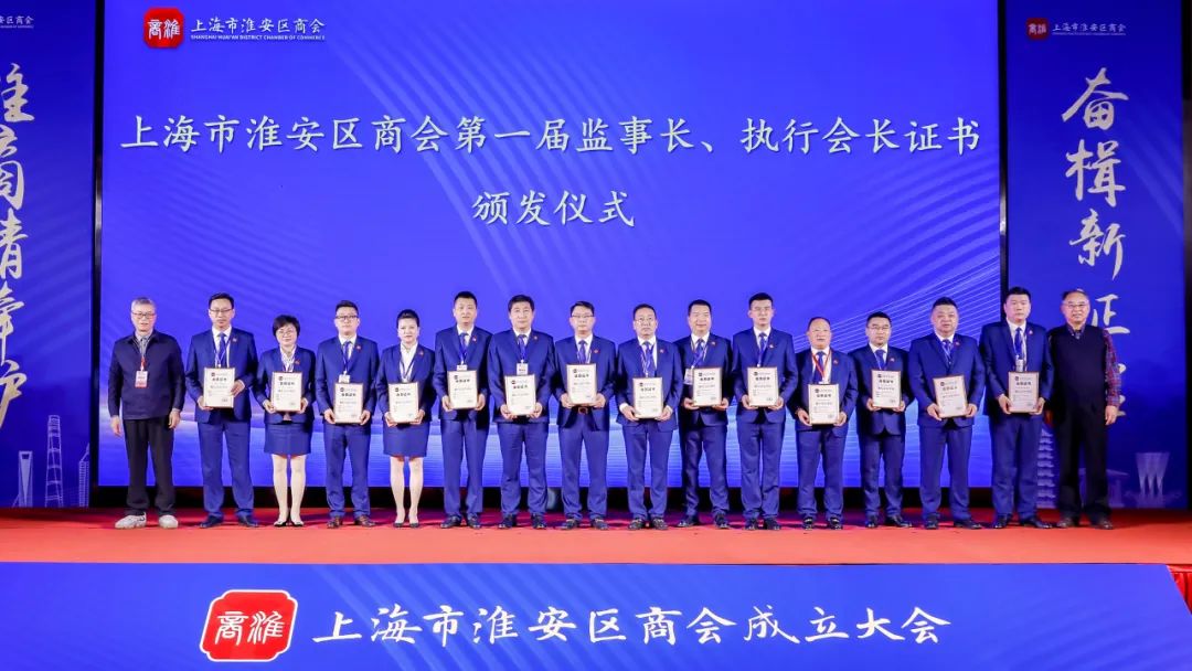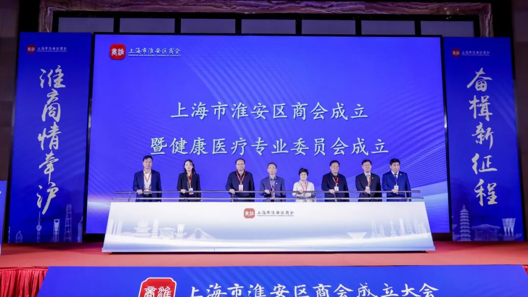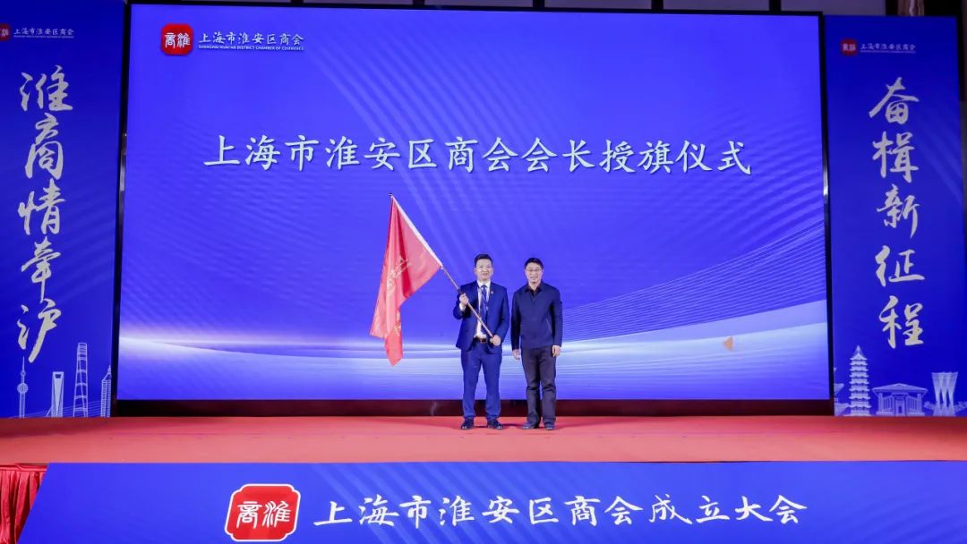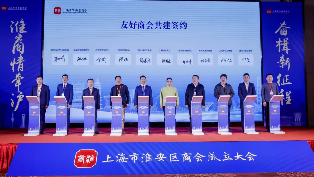 会上,举行了上海市淮安区商会揭牌仪式、会长授旗仪式,成立了健康医疗专业委员会,商会与9家异地商会结为友好共建商会。