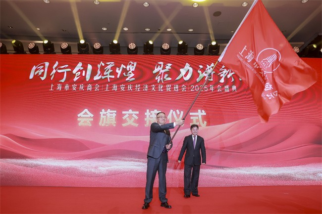 智租换电董事长李学军从上海市安庆商会第一、二届会长聂建明手中接过会旗