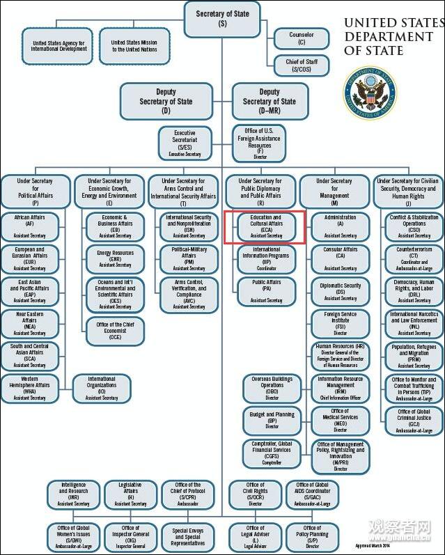 红色为玛丽·罗伊斯所在位置,比黄之瀚高出2个级别,但位于国务卿蓬佩奥底下3级 图自国务院