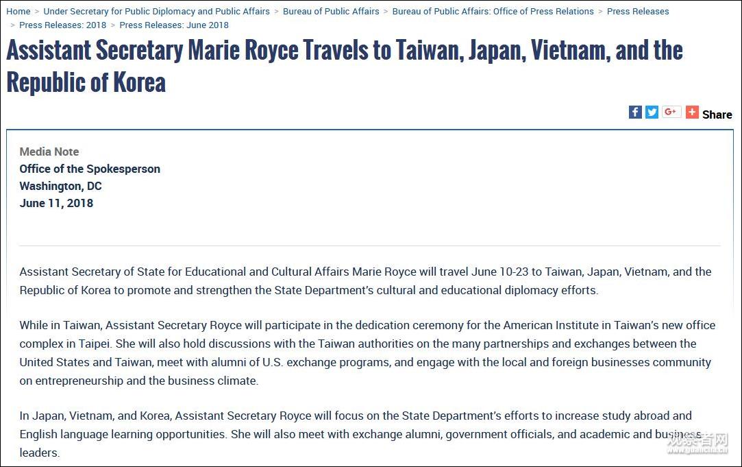 美国务院就“玛丽·罗伊斯赴台”的消息做出确认,后者随后还将前往日本、越南和韩国,商讨文化合作事宜 图自美国国务院