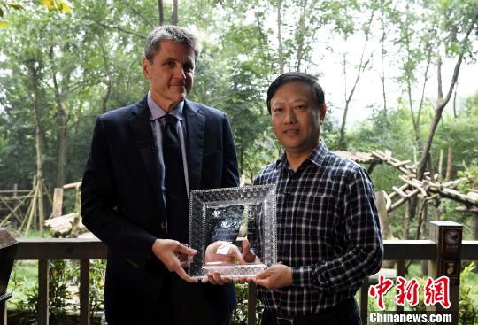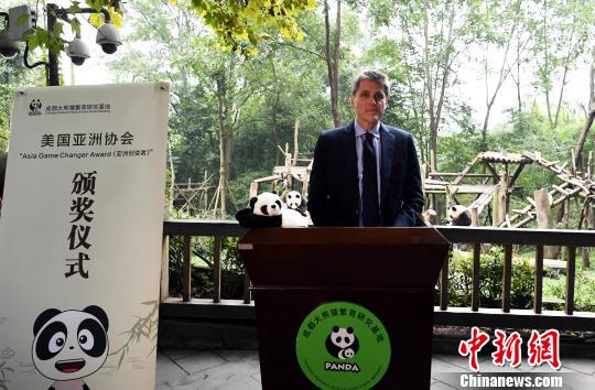 中新网成都10月28日电 (记者 安源)为了表彰中国国宝大熊猫在促进各国关系友好和传递生态保护理念中起到的重大推动作用,美国亚洲协会高级副总裁汤姆·纳戈尔斯基TomNagorski一行于28日在成都大熊猫繁育研究基地为中国国宝大熊猫颁发了“AsiaGameChangerAward(亚洲创变者)”奖。