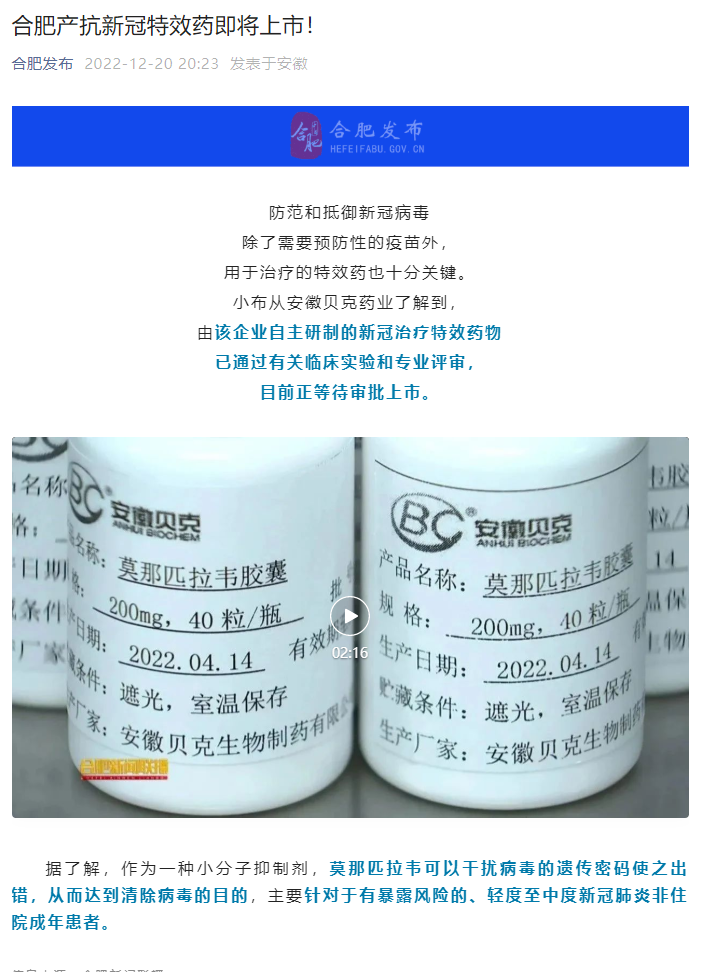 据合肥发布消息,由安徽贝克药业自主研制的新冠治疗特效药物已通过有关临床实验和专业评审,目前正等待审批上市。