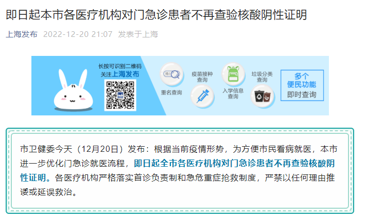 市卫健委今天(12月20日)发布:根据当前疫情形势,为方便市民看病就医,本市进一步优化门急诊就医流程,即日起全市各医疗机构对门急诊患者不再查验核酸阴性证明。各医疗机构严格落实首诊负责制和急危重症抢救制度,严禁以任何理由推诿或延误救治。