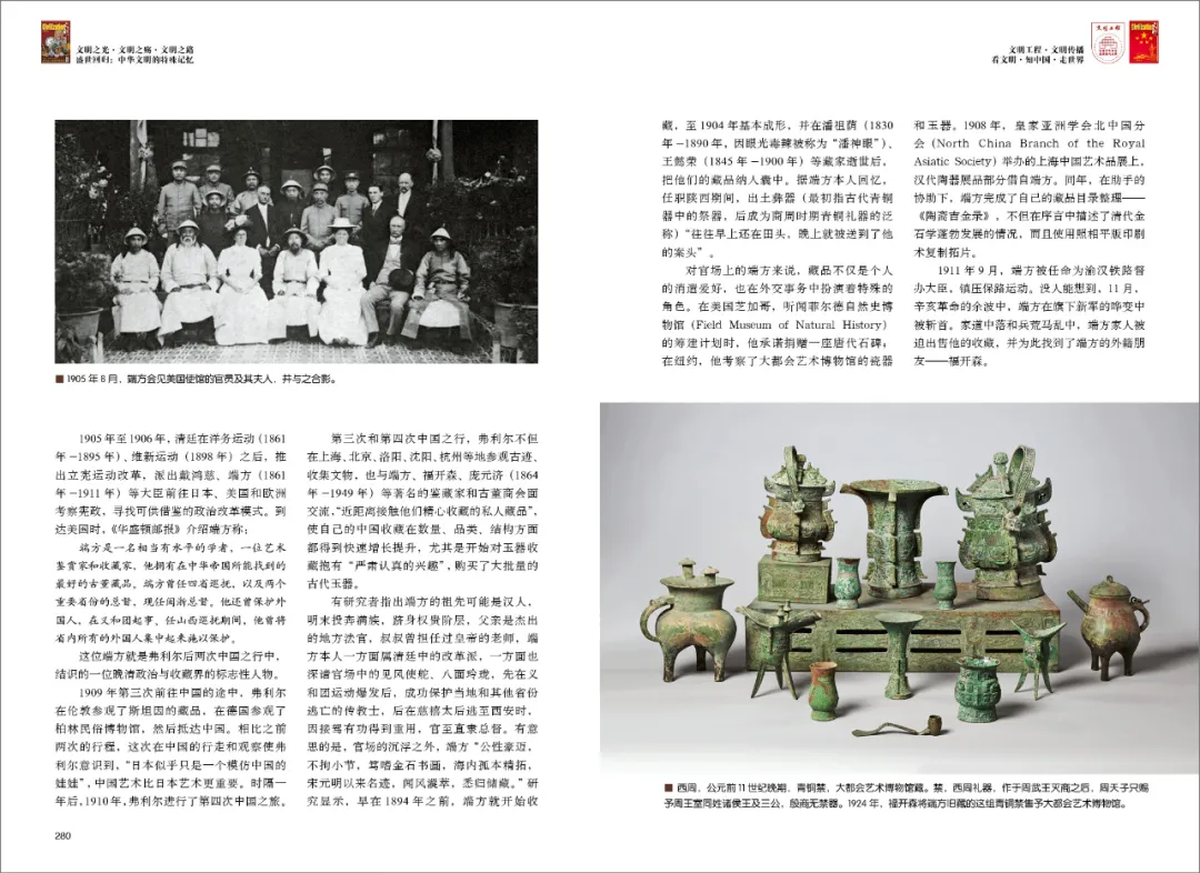 在美国芝加哥,听闻菲尔德自然史博物馆的筹建计划时,端方承诺捐赠一座唐代石碑;在纽约,他考察了大都会艺术博物馆的瓷器和玉器。1908年,皇家亚洲学会北中国分会举办的上海中国艺术品展上,汉代陶器展品部分借自端方。同年,在助手的协助下,端方完成了自己的藏品目录整理——《陶斋吉金录》,不但在序言中描述了清代金石学蓬勃发展的情况,而且使用照相平版印刷术复制拓片。