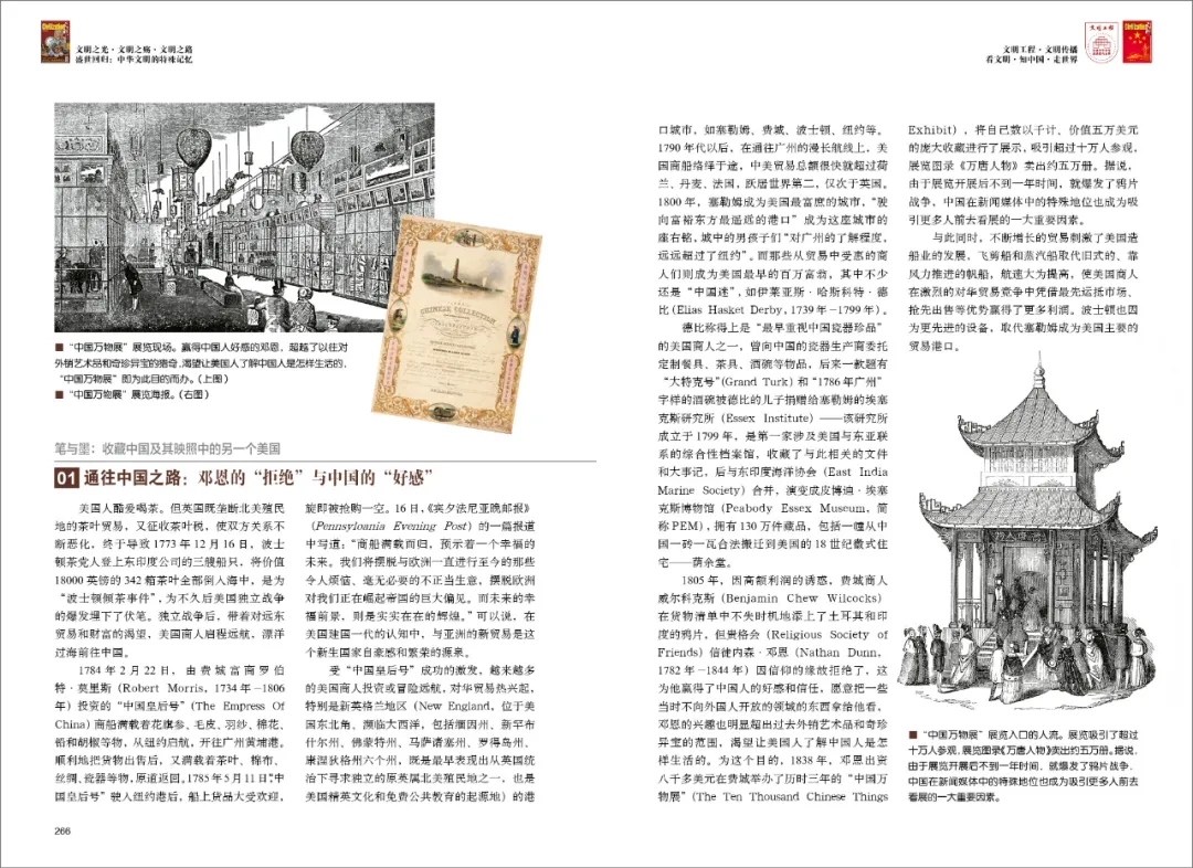 1784年2月22日,由费城富商罗伯特·莫里斯投资的“中国皇后号”商船满载着花旗参、毛皮、羽纱、棉花、铅和胡椒等物,从纽约启航,开往广州黄埔港。顺利地把货物出售后,又满载着茶叶、棉布、丝绸、瓷器等物,原道返回。1785年5月11日,“中国皇后号”驶入纽约港后,船上货品大受欢迎,旋即被抢购一空。可以说,在美国建国一代的认知中,与亚洲的新贸易是这个新生国家自豪感和繁荣的源泉。
