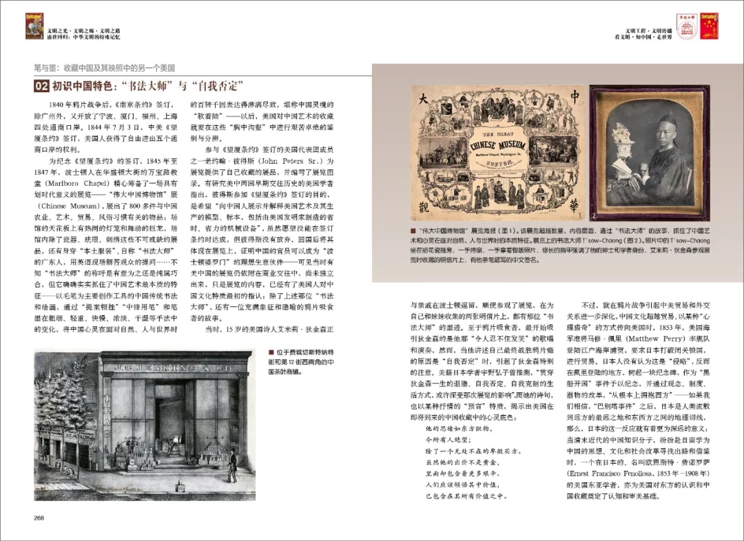 为纪念《望厦条约》的签订,1845年至1847年,波士顿人在华盛顿大街的万宝路教堂精心筹备了一场具有划时代意义的展览——“伟大中国博物馆”展,展出了800多件与中国农业、艺术、贸易、风俗习惯有关的物品:场馆的天花板上有热闹的灯笼和舞动的巨龙,场馆内除了瓷器、珐琅、刺绣这些不可或缺的展品,还有身穿“本土服装”、自称“书法大师”的广东人……不知“书法大师”的称呼是有意为之还是纯属巧合,但它确确实实抓住了中国艺术最本质的特征——以毛笔为主要创作工具的中国传统书法和绘画,通过“提案顿挫”“中锋用笔”和笔墨在粗细、轻重、快慢、浓淡、干湿等手法中的变化,将中国心灵在面对自然、人与世界时的百转千回表达得淋漓尽致,堪称中国灵魂的“软着陆”——以后,美国对中国艺术的收藏就要在这些“胸中沟壑”中进行艰苦卓绝的鉴别与分辨。