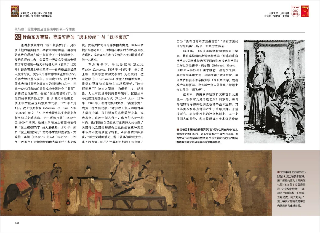 1896年,哈佛大学福格艺术博物馆开馆,成为新英格兰地区寻求亚洲珍宝的另一个划时代事件。晚年,费诺罗萨在《中日艺术源流》一书中,提出了以“线条、浓淡、色彩”三要素为核心的艺术批评方法(线条、浓淡为中国古代绘画最重要的审美要素,色彩乃西方绘画核心本质之一),认为唐宋之后的“文人画”湮灭了中国艺术的伟大传统,至于那些关于“文人画”的品评系统,不过是些不值一提的“蠢话”。这些观点对美国收藏中国的品鉴、选择产生了深远的影响(弗利尔即为其中代表),但也得罪了不少人,尤其是中国学者,导致《中日艺术源流》遭到冷淡对待。