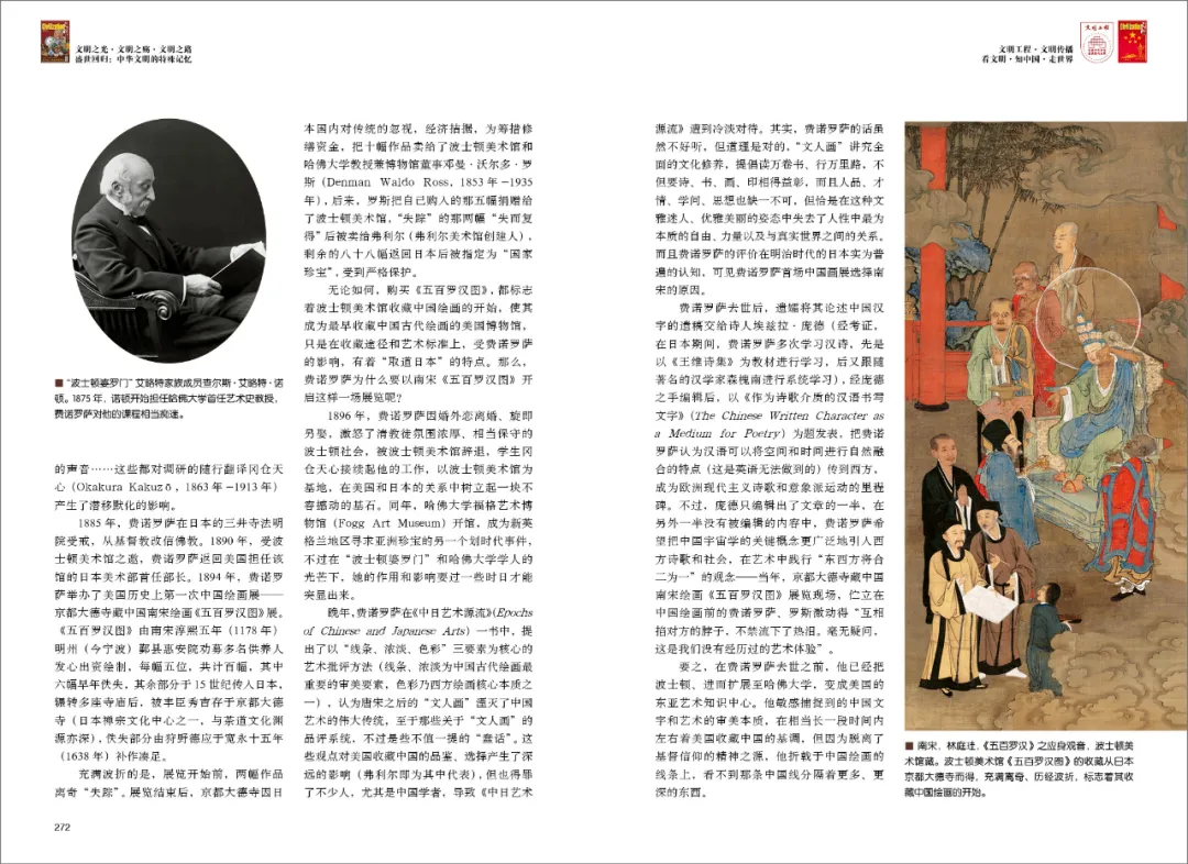 1885年,费诺罗萨在日本的三井寺法明院受戒,从基督教改信佛教。1890年,受波士顿美术馆之邀,费诺罗萨返回美国担任该馆的日本美术部首任部长。1894年,费诺罗萨举办了美国历史上第一次中国绘画展——京都大德寺藏中国南宋绘画《五百罗汉图》展。《五百罗汉图》由南宋淳熙五年(1178年)明州(今宁波)鄞县惠安院劝募多名供养人发心出资绘制,每幅五位,共计百幅,其中六幅早年佚失,其余部分于15世纪传入日本,辗转多座寺庙后,被丰臣秀吉存于京都大德寺(日本禅宗文化中心之一,与茶道文化渊源亦深),佚失部分由狩野德应于宽永十五年(1638年)补作凑足。
