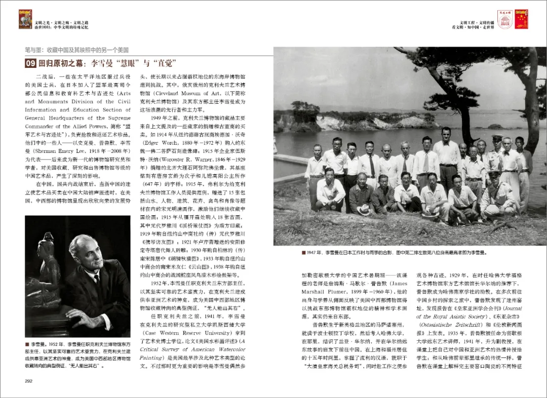 二战后,一些在太平洋地区服过兵役的美国士兵,在日本加入了盟军最高司令部公民信息和教育科艺术与古迹处(简称“盟军艺术与古迹处”),负责抢救和返还艺术珍品。他们中的一些人——以史克曼、普鲁默、李雪曼为代表——后来成为新一代的博物馆研究员和学者,对美国收藏、研究和出售博物馆等级的中国艺术品,产生了深刻的影响。