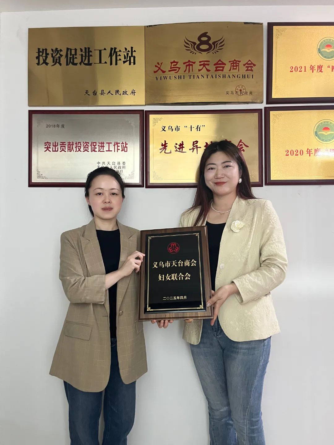 4月25日,天台县首个异地商会妇联组织——义乌市天台商会妇女联合会正式成立。县妇联党组书记、主席庞静组织授牌。