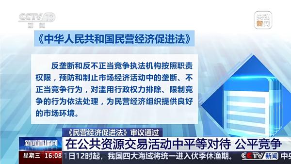 全国人大常委会法工委经济法室主任 杨合庆:规定市场准入负面清单以外的领域,包括民营经济组织在内的各类经济组织可以依法平等进入;对落实公平竞争审查制度、定期清理市场准入壁垒、禁止在公共资源交易活动中限制或者排斥民营经济组织等作出规定。