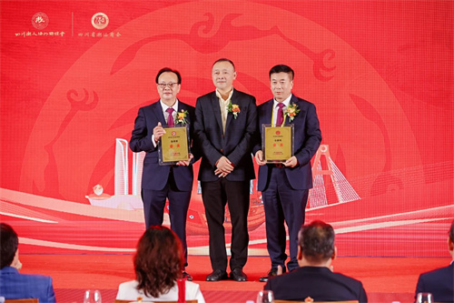 颁发会长牌匾,左:四川潮人海外联谊会第六届会长陈湖南;右:四川省潮汕商会第三届会长余鹤鸣