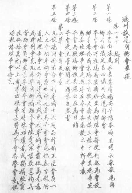 从商会领导人和资金来源看,温州同乡会逐渐从官员和文化人为主的同乡组织,出现了商人的身影,并有不少为工商业服务的事件。根据《温州旅杭同乡会章程》,本会为旧温属永嘉、乐清、瑞安、平阳、泰顺、玉环六县同乡所组织。同乡会以“联络同乡情谊、协谋公共利益”为宗旨,“内以援本郡之缓急、外以拯侨民之颠危。”