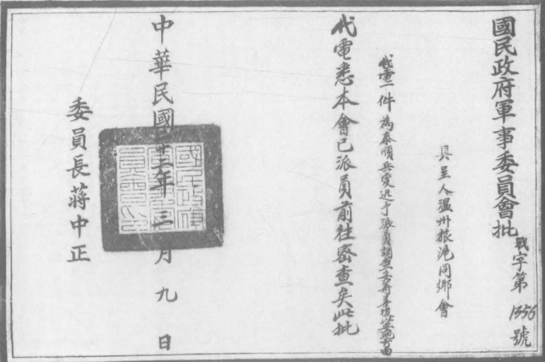 南京国民政府军事委员会给温州旅沪同乡会的批文
