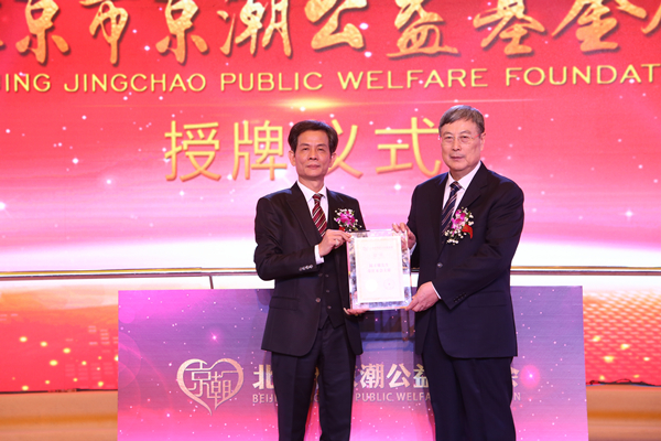 第十一届全国政协副主席黄孟复为北京市京潮公益基金会主席、北京潮籍公益志愿者服务中心荣誉理事长陈才雄授牌