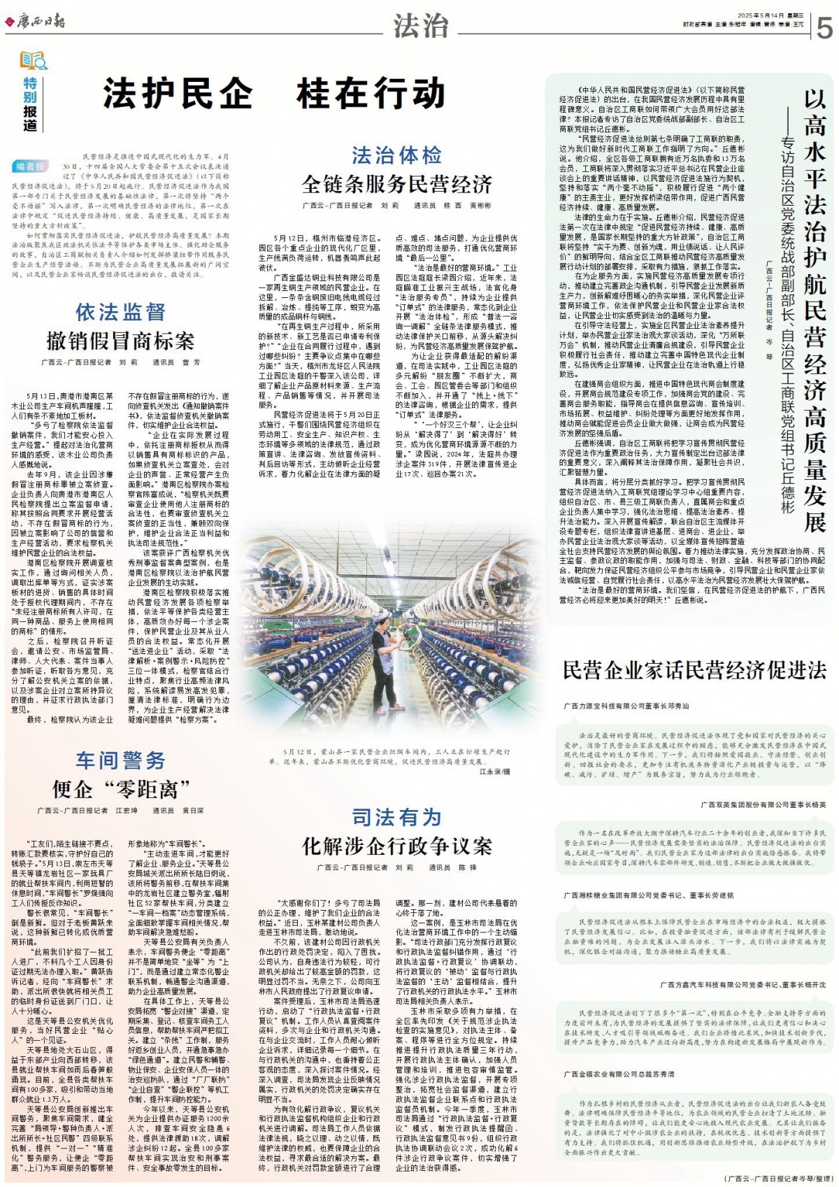 新闻眼民营经济是推进中国式现代化的生力军。4月30日,十四届全国人大常委会第十五次会议表决通过了《中华人民共和国民营经济促进法》(以下简称民营经济促进法),将于5月20日起施行。民营经济促进法作为我国第一部专门关于民营经济发展的基础性法律,第一次将坚持“两个毫不动摇”写入法律,第一次明确民营经济的法律地位,第一次在法律中规定“促进民营经济持续、健康、高质量发展,是国家长期坚持的重大方针政策”。 故事 依法监督,撤销假冒商标案 广西云-广西日报记者 刘 莉 通讯员 曾 芳 5月13日,贵港市港南区某木业公司生产车间机声隆隆,工人们有条不紊地加工板材。 “多亏了检察院依法监督撤销案件,我们才能安心投入生产经营。”提起对法治化营商环境的感受,该木业公司负责人感慨地说。 去年9月,该企业因涉嫌假冒注册商标罪被立案侦查。企业负责人向贵港市港南区人民检察院提出立案监督申请,称其按照合同要求开展经营活动,不存在假冒商标的行为,因被立案影响了公司的信誉和生产经营活动,要求检察机关维护民营企业的合法权益。 港南区检察院开展调查核实工作,通过询问相关人员,调取出库单等方式,证实涉案板材的进货、销售的具体时间处于授权代理期间内,不存在“未经注册商标所有人许可,在同一种商品、服务上使用相同的商标”的情形。 之后,检察院召开听证会,邀请公安、市场监管局、律师、人大代表、案件当事人参加听证,听取各方意见,充分了解公安机关立案的依据,以及涉案企业对立案所持异议的理由,并征求行政执法部门意见。 最终,检察院认为该企业不存在假冒注册商标的行为,遂向侦查机关发出《通知撤销案件书》,依法监督侦查机关撤销案件,切实维护企业合法权益。 “企业在实际发展过程中,依托注册商标授权从而得以销售具有商标标识的产品,如果侦查机关立案查处,会对企业的声誉、正常经营产生负面影响。”港南区检察院办案检察官陈富成说,“检察机关既要审查企业使用他人注册商标的合法性,也要审查侦查机关立案侦查的正当性,兼顾双向保护,维护企业合法正当利益和执法司法规范性。” 该案获评广西检察机关优秀刑事监督案典型案例,也是港南区检察院以法治护航民营企业发展的生动实践。 港南区检察院积极落实推动民营经济发展各项检察举措,依法平等保护各类经营主体,高质效办好每一个涉企案件,保护民营企业及其从业人员的合法权益。常态化开展“送法进企业”活动,采取“法律解析+案例警示+风险防控”三位一体模式,检察官结合行业特点,聚焦行业高频法律风险,系统解读易发高发犯罪,厘清法律标准,明确行为边界,为企业生产经营解决法律疑难问题提供“检察方案”。 法治体检,全链条服务民营经济 广西云-广西日报记者 刘 莉 通讯员 桂 西 黄彬彬 5月12日,梧州市临港经济区。园区各个重点企业的现代化厂区里,生产线满负荷运转,机器轰鸣声此起彼伏。 广西金盛达铜业科技有限公司是一家再生铜生产领域的民营企业。在这里,一条条含铜废旧电线电缆经过拆解、冶炼、提纯等工序,蜕变为高质量的成品铜杆与铜线。 “在再生铜生产过程中,所采用的新技术、新工艺是否已申请专利保护?”“企业在合同履行过程中,遇到过哪些纠纷?主要争议点集中在哪些方面?”当天,梧州市龙圩区人民法院工业园区法庭的干警深入该公司,详细了解企业产品原材料来源、生产流程、产品销售等情况,并开展司法服务。 民营经济促进法将于5月20日正式施行,干警们围绕民营经济组织在劳动用工、安全生产、知识产权、生态环境等多领域的法律规范,通过政策宣讲、法律咨询、发放宣传资料、判后回访等形式,主动倾听企业经营诉求,着力化解企业在法律方面的疑点、难点、堵点问题,为企业提供优质高效的司法服务,打通优化营商环境“最后一公里”。 “法治是最好的营商环境。”工业园区法庭庭长梁园介绍,近年来,法庭瞄准工业振兴主战场,法官化身“法治服务专员”,持续为企业提供“订单式”的法律服务,常态化到企业开展“法治体检”,形成“普法—咨询—调解”全链条法律服务模式,推动法律保护关口前移,从源头解决纠纷,为民营经济高质量发展保驾护航。 为让企业获得最适配的解纷渠道,在司法实践中,工业园区法庭的多元解纷“朋友圈”不断扩大,商会、工会、园区管委会等部门和组织不断加入,并开通了“线上+线下”的法律咨询,根据企业的需求,提供“订单式”法律服务。 “‘一个好汉三个帮’,让企业纠纷从‘解决得了’到‘解决得好’转变,成为优化营商环境源源不断的力量。”梁园说,2024年,法庭共办理涉企案件319件,开展法律宣传进企业17次、巡回办案21次。