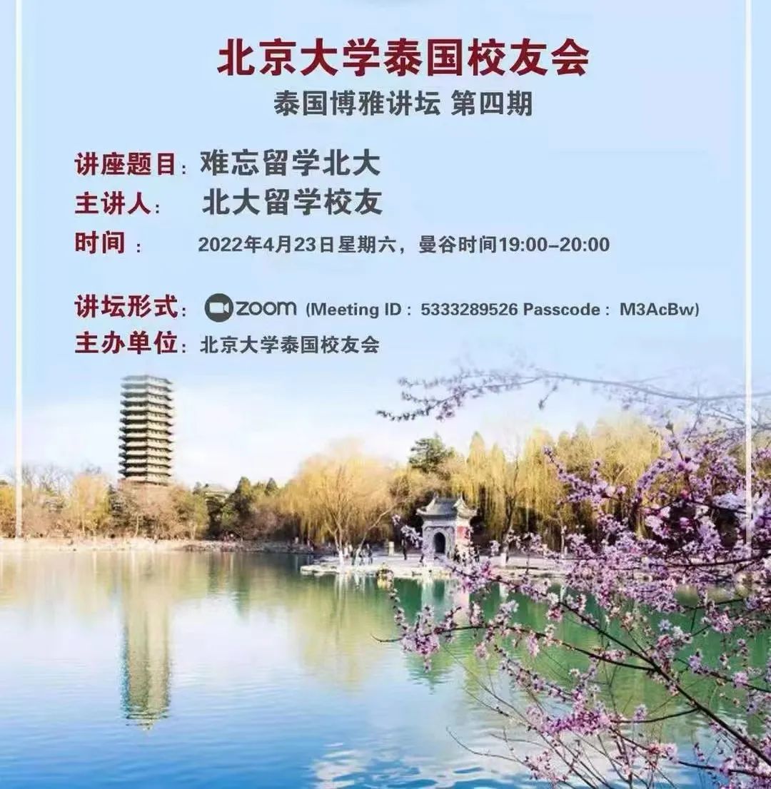 活动概述:为了庆祝北大校庆及北大开展留学生教育70周年活动,北大泰国校友会将在4月23日19:00,举办泰国博雅讲坛第4期主题为“难忘留学北大”。