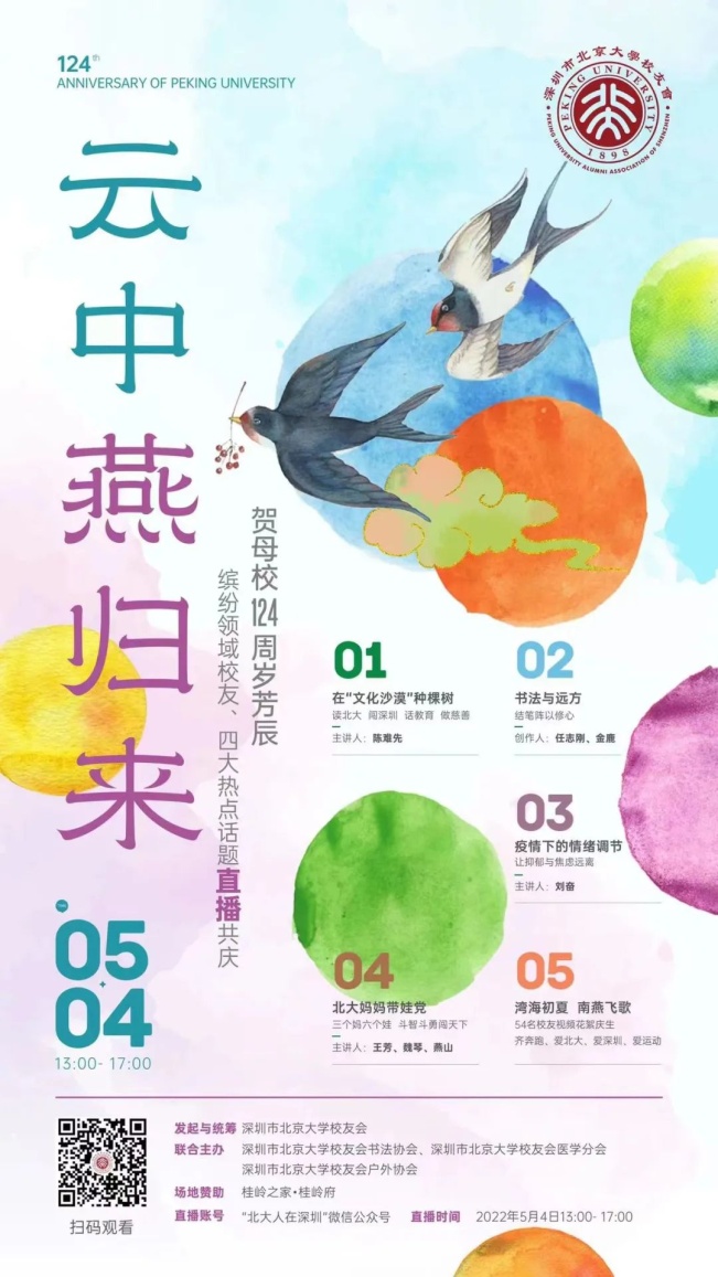 活动概述:贺母校124周岁芳辰,深圳校友会特别策划一场直播+录播活动,特别邀请资深学长及热心校友,并联合书法协会、医学分会、户外协会共同带来一场诸多热点话题的直播共庆。