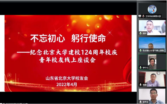 活动概述:为庆祝母校124周年华诞和纪念五四运动,4月26日晚,山东校友会以在线视频会议形式召开不忘初心,躬行使命——纪念北京大学建校124周年校庆青年校友线上座谈会,30余位校友参加线上座谈会。