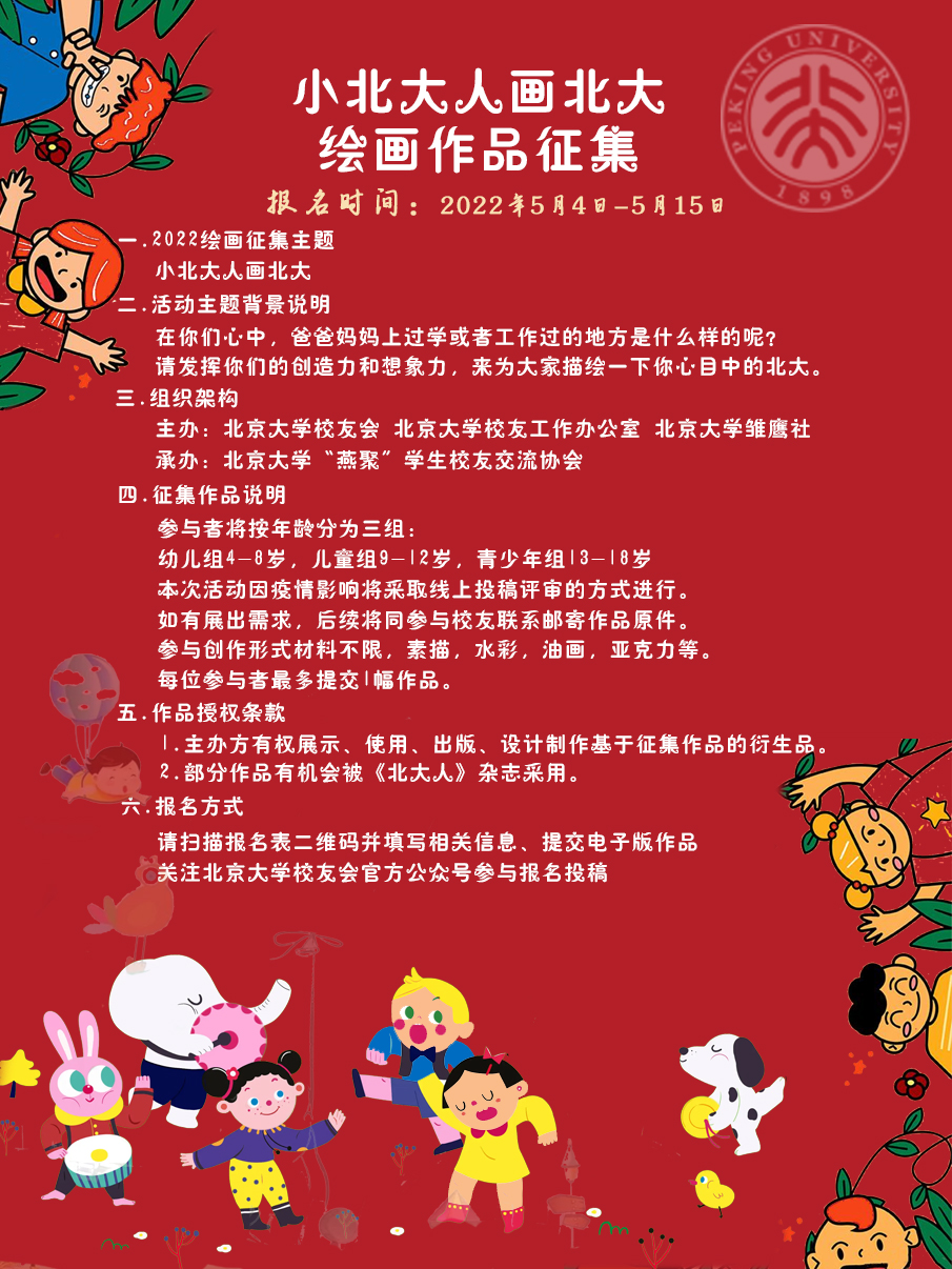 活动概述:为庆祝北京大学124周年校庆,北京大学校友会、校友工作办公室,北京大学雏鹰社联合发起以“小北大人画北大”为主题的绘画作品征集活动,诚邀各位校友带着自己的孩子共同回忆、描绘母校。大手牵小手,共绘北大情。