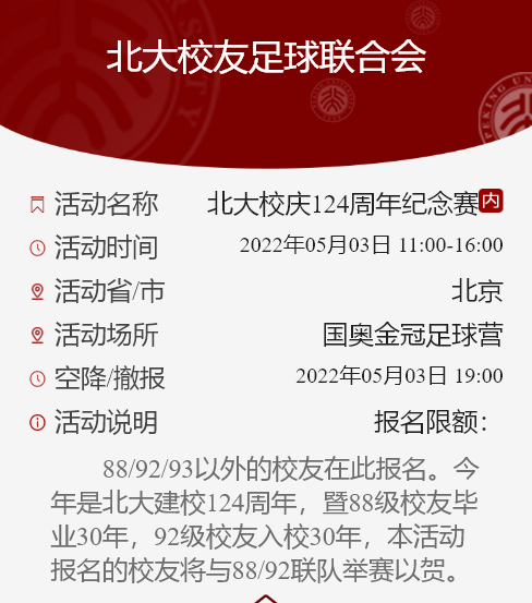 活动概述:北京大学校友会户外运动分会组织全球各地校友,以年级、院系、地域等形式组队报名参加,线上打卡。2022年4月30日至5月4日期间跑步公里数大于5.4公里,上传相关轨迹图片即可获得证书。