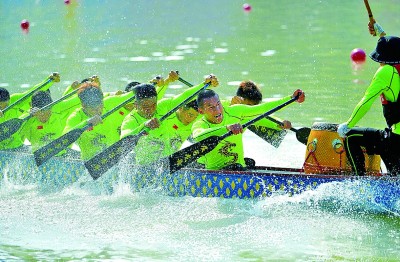 龙舟队在湖北宣恩县贡水河上参加龙舟比赛。 新华社发