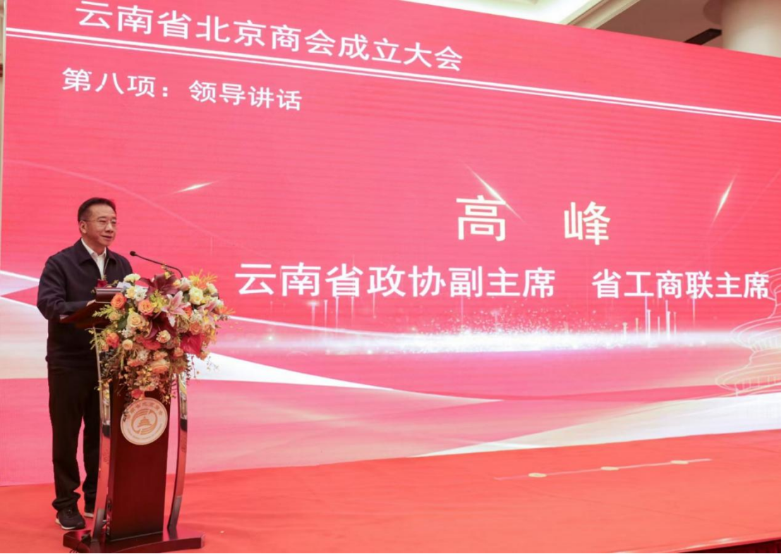 ▲省政协副主席、省工商联主席高峰在云南省北京商会成立大会上致辞。