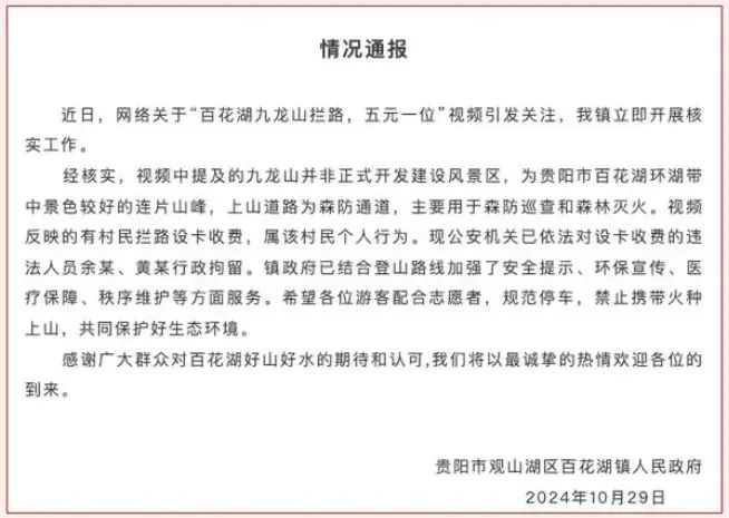 ▲10月28日,有网友爆料称贵州几位村民在一疑似景点入口处拦路收费,甚至挡在车前不肯让步。对此,贵阳市观山湖区百花湖镇政府回应称,涉事村民对每位进林区游玩的客人收取5元费用,共收取了15人,这完全是村民个人行为,已对收费村民进行训诫谈话,责成将75元交到村委会退还。