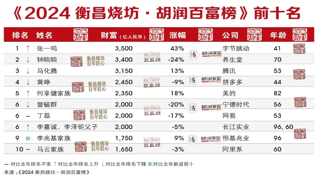 ▲10月29日,胡润研究院发布2024胡润百富榜,1094位个人财富50亿元人民币以上的企业家登榜。上榜企业家总财富比去年下降10%(2.4万亿),至21万亿元。牧原秦英林、钱瑛夫妇以1350亿元位列胡润百富榜第16位,同时也是河南首富。