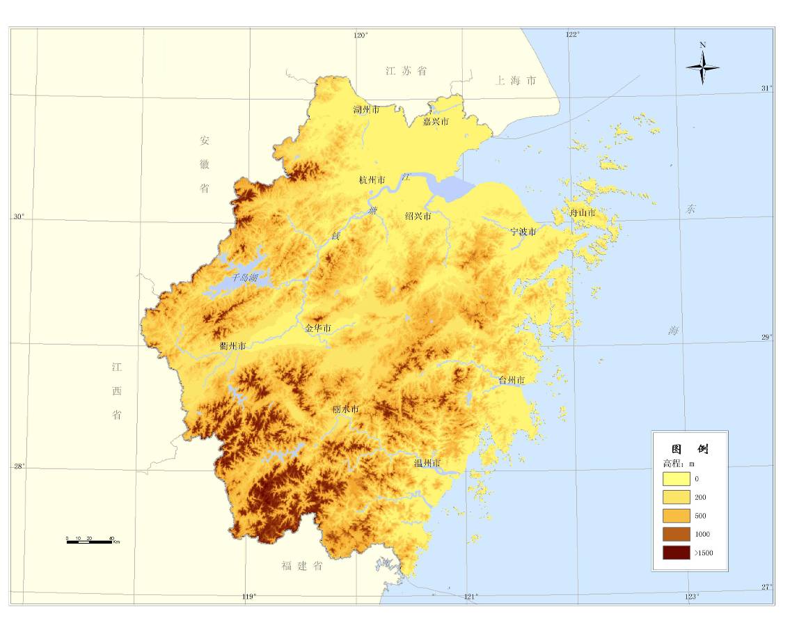 浙江省地势西南高、东北低,自西南向东北倾斜,呈梯级下降。西南多为千米以上的群山峻岭,主要山峰均在1500m以上,其中位于龙泉市境内的黄茅尖,海拔1929m,为全省最高峰。地形以丘陵山地为主,占全省总面积70.4%。全省各大河流均源出西部山区。中部以丘陵为主,大小盆地错落分布于丘陵山峰之间。东北部为冲积、沉积平原,地势平坦,土层深厚,河网密布。有些山脉一直延伸到东海,露出水面的山峰构成半岛和岛屿。