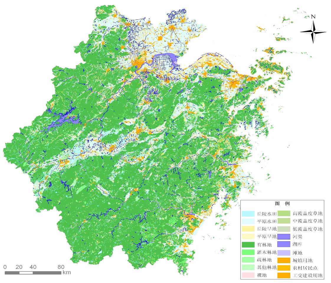 据2008年土地变更调查,浙江省土地总面积10.54×104hm2,其中农用地8.67×104hm2,占82.3%;建设用地1.05×104hm2,占9.9%;未利用地0.82×104hm2,占7.8%。农用地面积中,耕地1.92×104hm2,占全省农用地面积的22.2%;园地占7.6%;林地占64.9%。建设用地面积中,居民点及独立工矿用地0.82×104hm2,占全省建设用地面积的77.9%,交通运输用地占9.0%,水利设施用地占13.1%。
