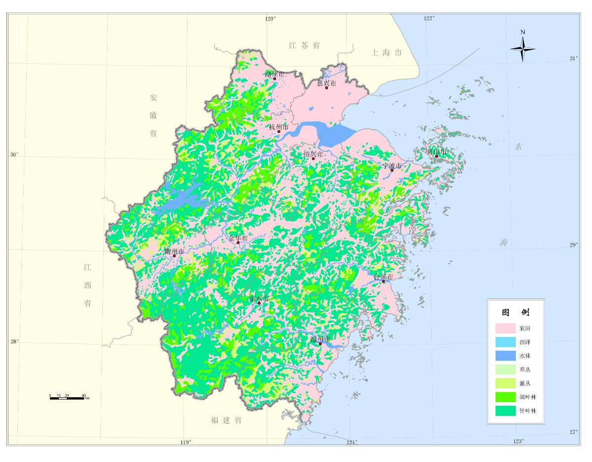 浙江省大部分地区被划为中亚热带常绿阔叶林北部亚地带-浙皖山丘青冈苦槠林栽培植被区和浙闽山丘甜槠木荷林区,只有雁荡山以东、玉环岛以南的浙东南沿海一隅,属中亚热带常绿阔叶林南部亚热带-浙南闽中山栲类细柄蕈树林区。植被具有明显的亚热带性质,其组成种类繁多,类型复杂、次生性强,地域分异明显。现状植被可分为天然植被和人工植被两大系列,下属多个植被类型。主要植被类型有针叶林、针阔叶树混交林、阔叶林、灌丛和灌草丛、沼泽和沼泽化草甸、水生植被、人工植被等。其中针叶林则是我省森林中面积最大、分布最广的植被类型,并且多为层次单一的常绿针叶纯林。森林资源主要分布在浙南和浙西北地区,约占全省森林资源的80%以上,沿海地区及浙北平原相对较少。