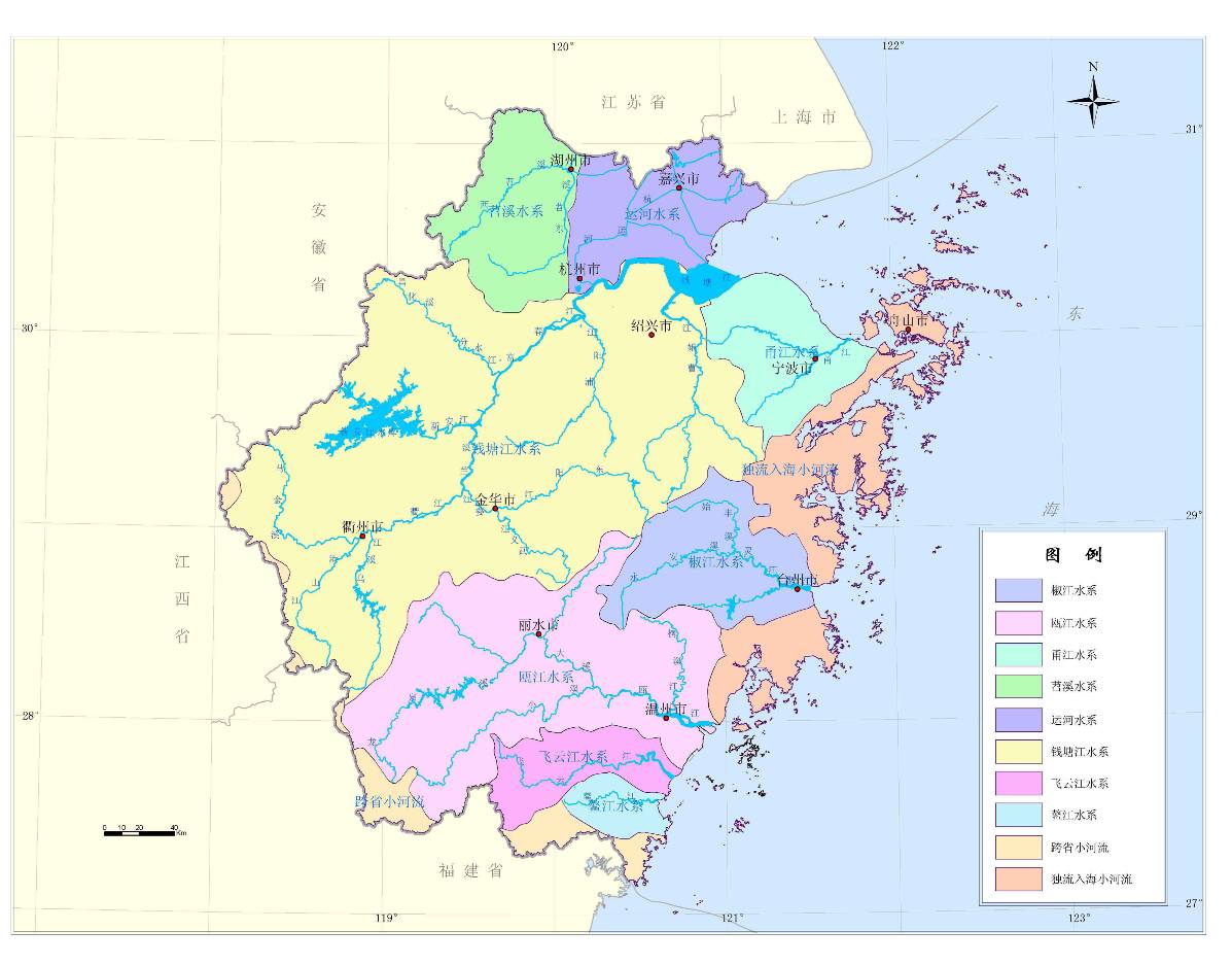 浙江省江河众多,多年平均水资源总量9.24×1010m3。流域面积在100km2公里以上的河流有238条,自北至南分布着苕溪、运河、钱塘江、甬江、椒江、瓯江、飞云江和鳌江等八大水系,除苕溪汇入太湖、运河连通长江水系外,其余均独流入海。钱塘江是全省第一大江,全长668km,省境内流域面积占全省陆域面积的47%。浙北的杭嘉湖平原和宁绍平原,以京杭运河和杭甬运河为主干,天然湖泊星罗棋布,河湖相连,水网密布,素有“水乡泽国”之称。