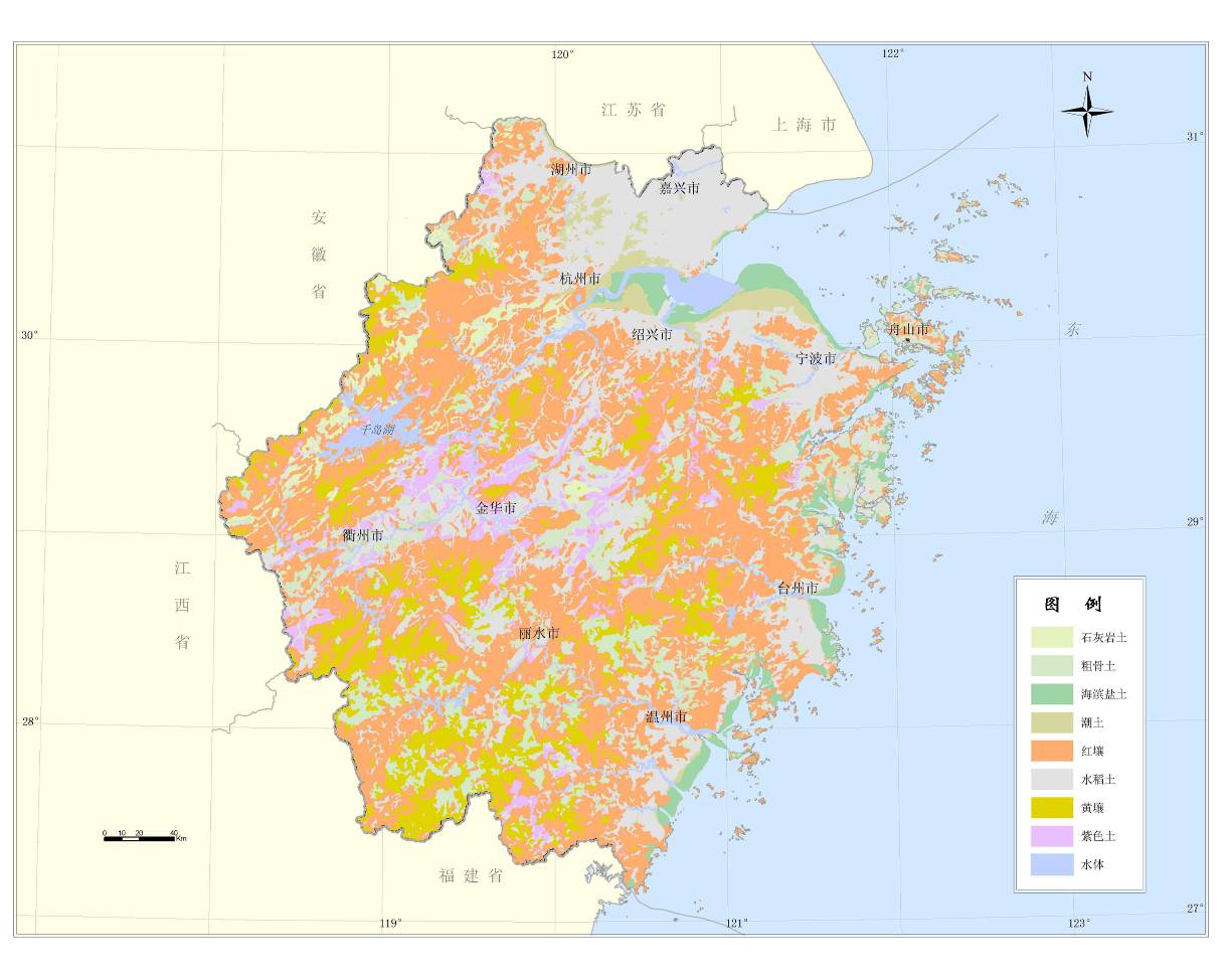 浙江省土壤类型十分丰富,主要有红壤、黄壤、水稻土、潮土和滨海盐土、紫色土、石灰土、粗骨土等。土壤的类型与分布受地形、气候、母质、水文等自然条件和人类活动的影响,有着明显的区域分布特征。其中面积较大,与农业生产关系密切的土壤类型有红壤、水稻土、滨海盐土和潮土等四类。红壤在浙江省分布面积最大,主要分布在浙南、浙东、浙西丘陵山地,具有粘、酸、瘦等主要肥力特征,旱季保水性能差;水稻土分布面积其次,是经过长期平整土地、修筑排灌系统、耕耘、轮作形成的人为土壤,主要分布在浙北平原和浙东南滨海平原;滨海平原分布着滨海盐土,土壤性状的主要特征是土体中含盐量高,成为农业生产的限制因素;潮土类分布在江河两岸及杭嘉湖平原,土层深厚,水源丰富,土质肥沃,是粮食、棉麻、蚕桑、蔬菜、瓜类等作物及林果的重要生产基地。