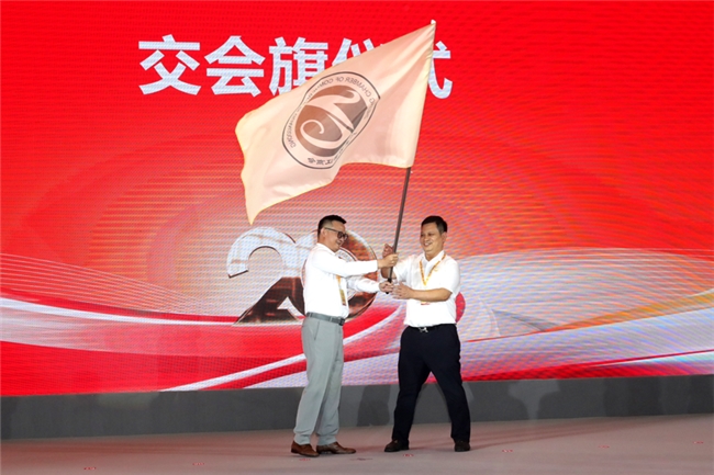 (第五理事会会长胡刚锋将商会会旗郑重地交接给第六届理事会会长吴松喜手中,标志着商会责任的传承与使命的延续。)
