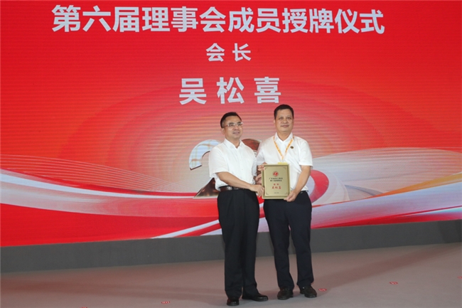 (广东省工商联党组成员、专职副主席冯日光为吴松喜会长颁发牌匾,象征着新一届理事会正式肩负起引领商会发展的重任。)