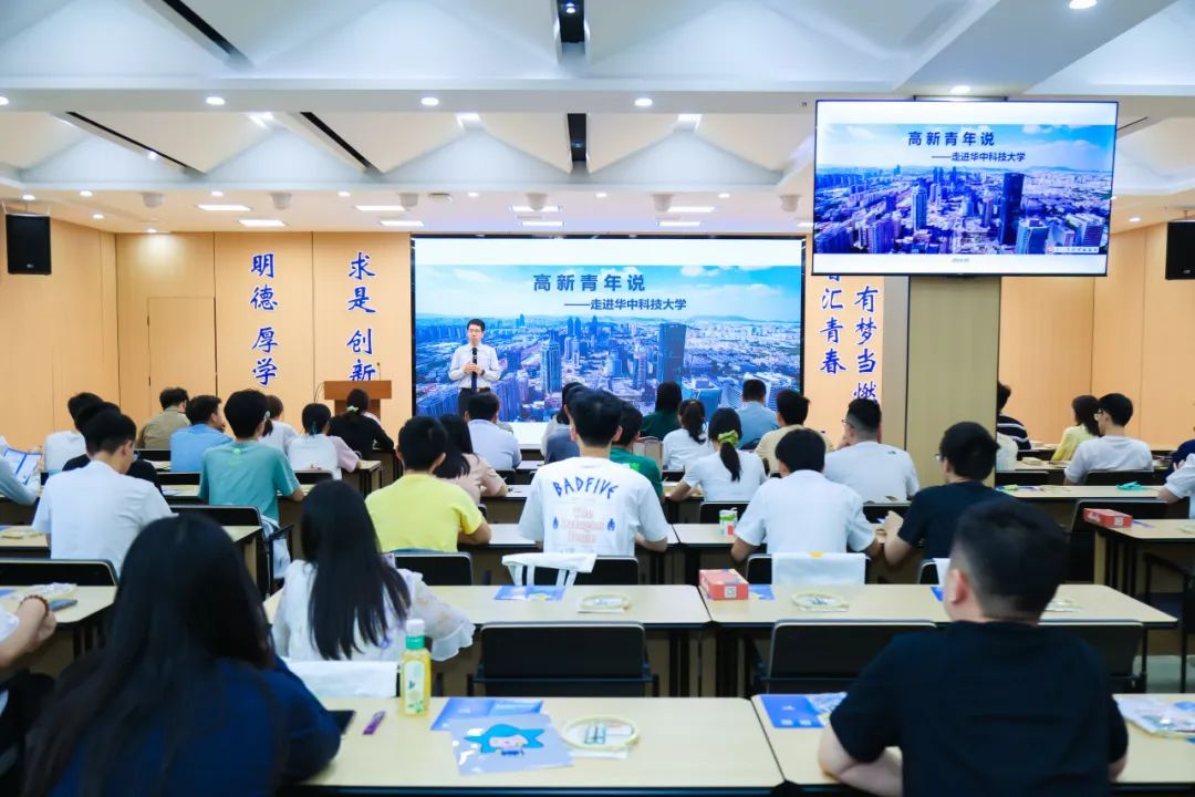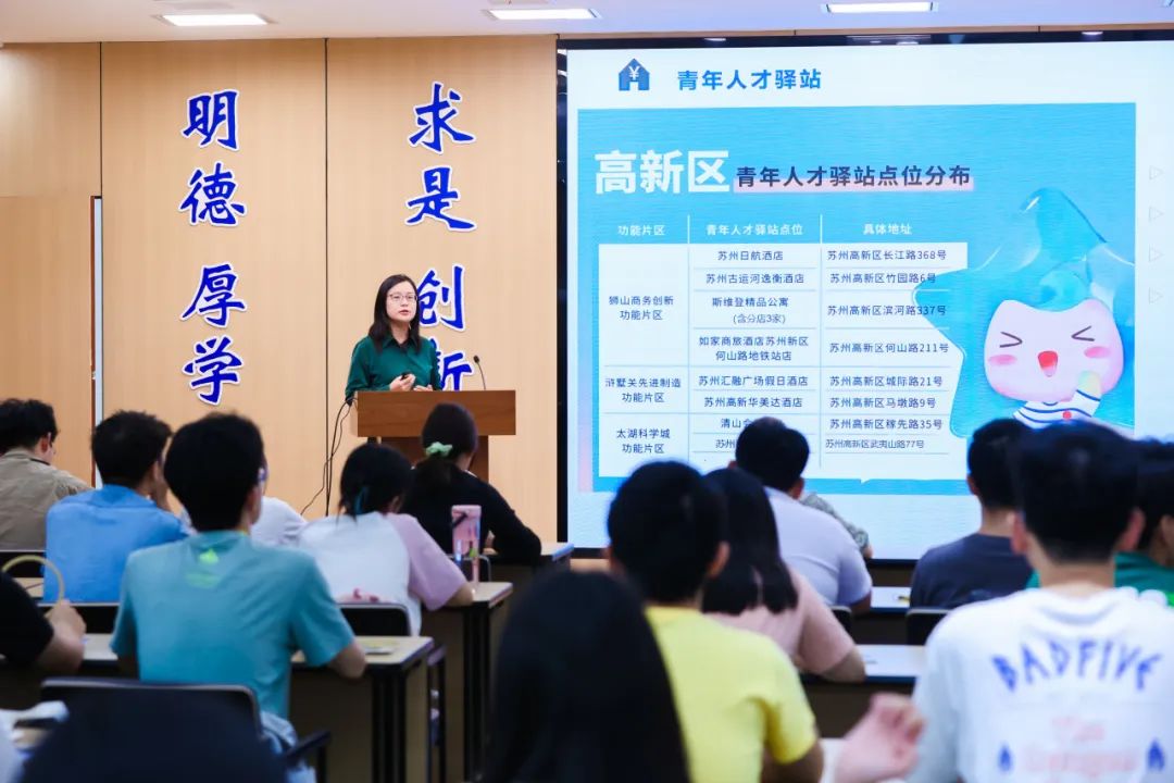 在紫菘学生活动中心举行的“高新青年说”活动中,金雨菲围绕苏州高新区青年发展环境作推介,重点介绍了青年人才驿站、“繁‘新’计划”等青年政策并诚挚邀请华科大学子来到苏州高新区实习实践、就业生活。