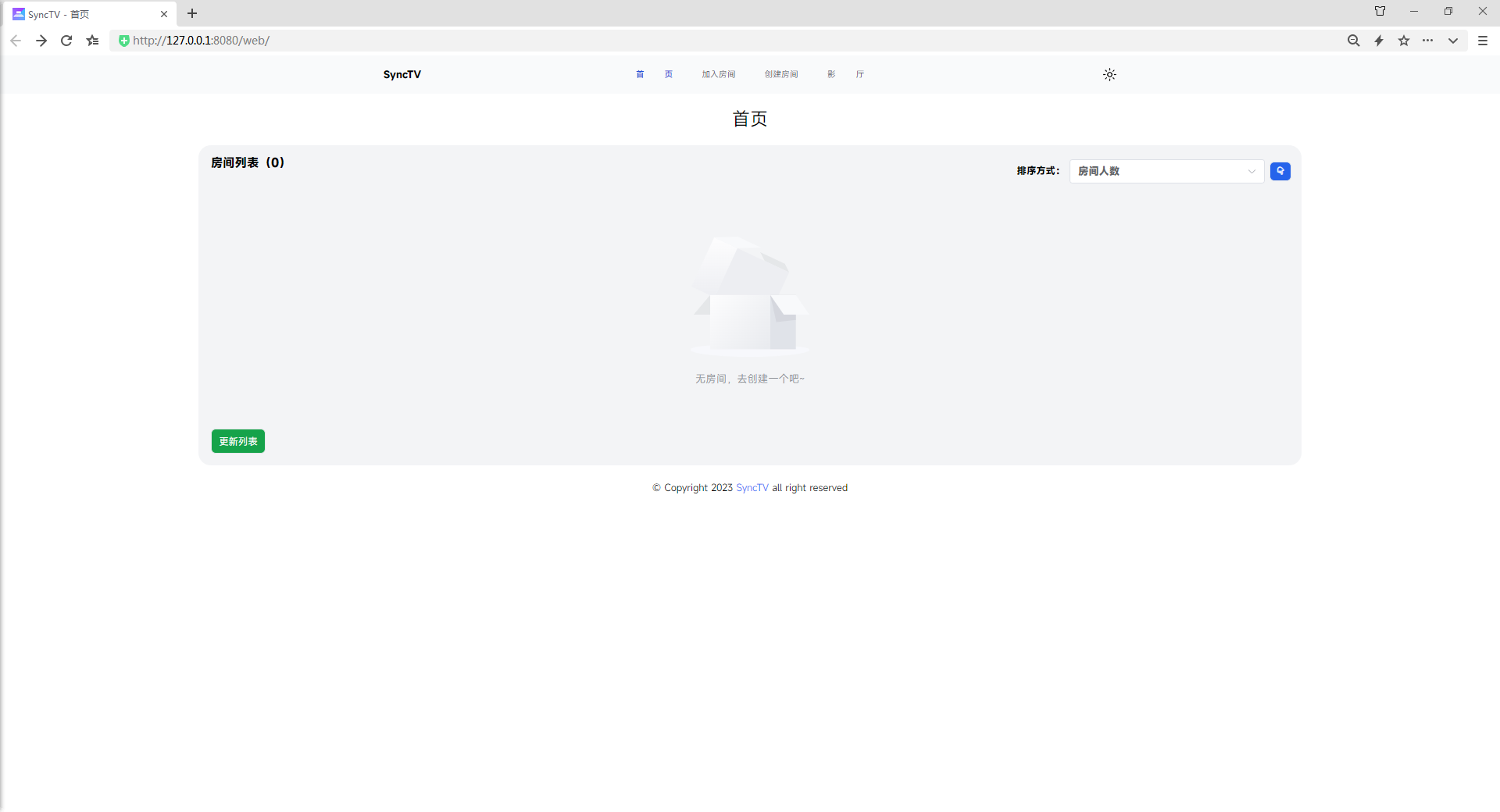 启动_synctv.vbs Dim ws Set ws = Wscript.CreateObject("Wscript.Shell") ws.run "synctv-windows-amd64.exe server -f ./config.yaml",vbhide Wscript.quit 停止_synctv.vbs Dim ws Set ws = Wscript.CreateObject("Wscript.Shell") ws.run "taskkill /f /im synctv-windows-amd64.exe",0 Wscript.quit 0x4 亲自体验教程我们运行后进来十分简洁,顶部能看到 首页、加入房间、创建房间、影厅 没有多余的选项