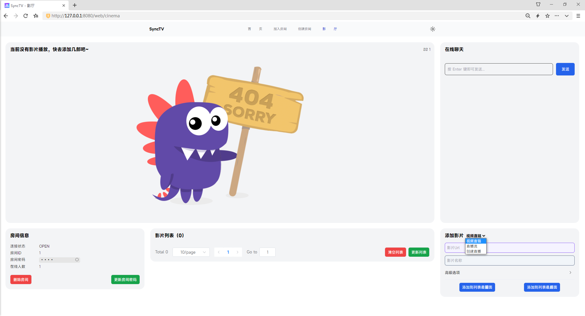支持添加视频直链,例如AList的视频直链 到时候和你女朋友一起看,一个宿舍、一个班级、一家人、一个群、一个公司/部门等一伙人一起看
