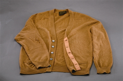 这是何朝育穿过的一件黄色针织衫外套,手臂部分甚至穿出了破洞。