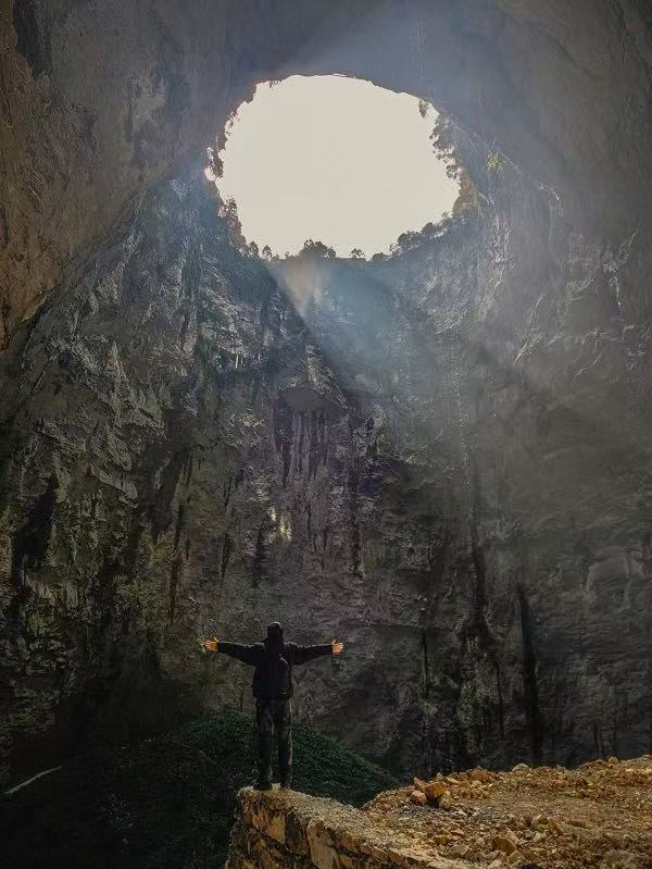 矅天眼景区刚获评国家AAAA级景区。这座形成于2.5亿年前三叠纪的巨型天坑,以290米的深度、5.8万平方米的底部面积被誉为“地球的眼睛”。今年3月,垂直观光电梯建成,仅用50秒便能将游客从坑口送至底部,让天坑可望也可即。步出电梯,坑内多条瀑布洒下的水雾与阳光交织成彩虹,4亿年前的奥陶纪化石与藤蔓苔藓植被构成“远古秘境”。“站在坑底仰望,岩壁的褶皱仿佛在诉说亿万年的故事,这种震撼是任何镜头都无法复刻的。”来自泰国的旅游博主闻名不断调整拍摄角度,希望让他粉丝们看到最惊艳的地质奇观。